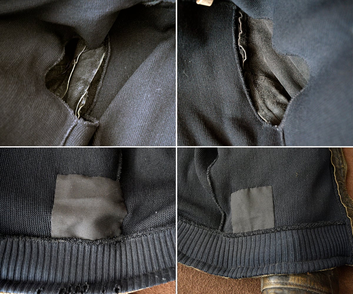 ③裏地はおそらく全部はがされて、素人によってニットを縫い付けて補修してあります。