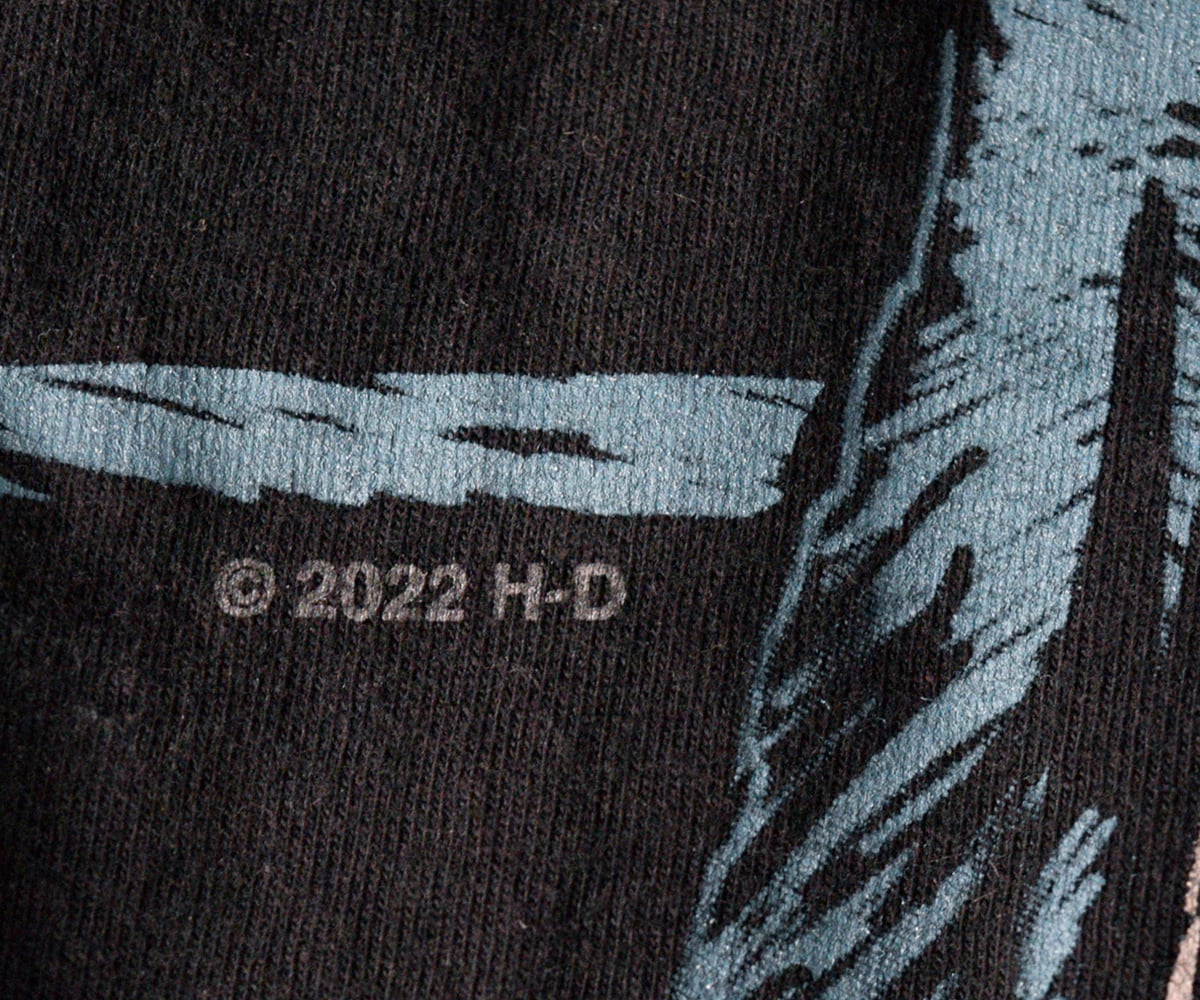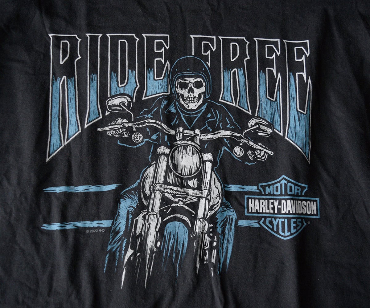 どこか愛らしいスカルバイカーのイラストと「RIDE FREE」のユニークなタイピング。