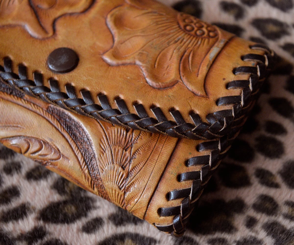 フラワー柄のエンボス型押しレザーはハンドメイド。