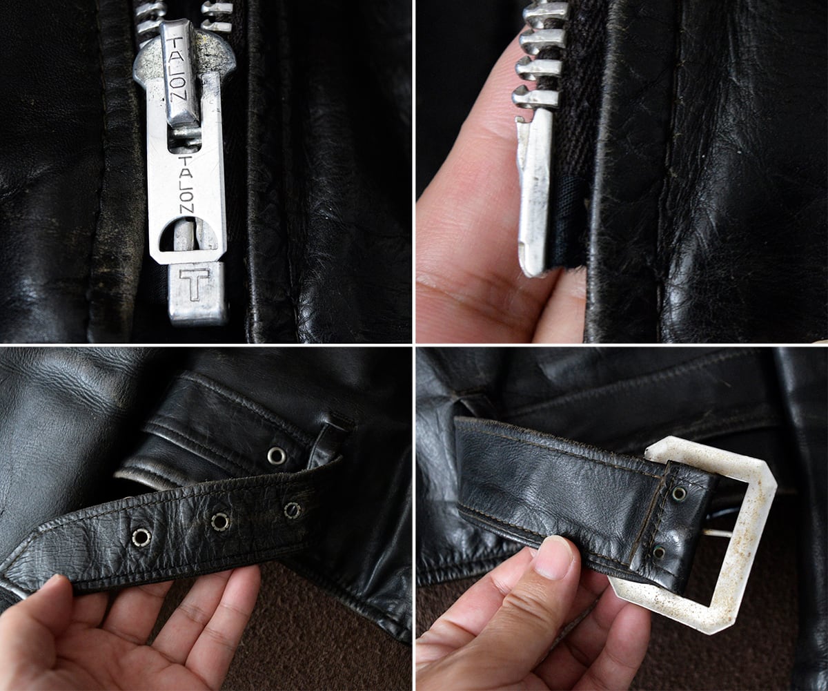 メインはデカアルミTALONジッパー、ボディはチェーンジッパー、袖はベル型ジッパー。