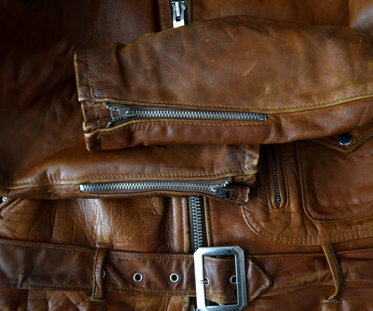 ボディはチェーンジッパー。バックルは厚めの八角バックル。袖のガゼットは本革仕様。