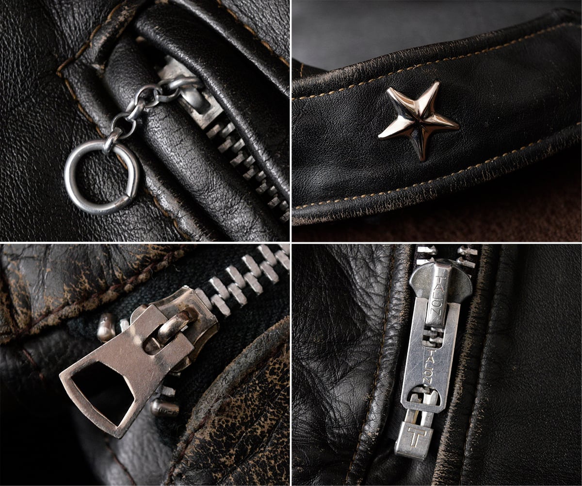 肩には10爪スタースタッズ、裾にはベルトループが完備、