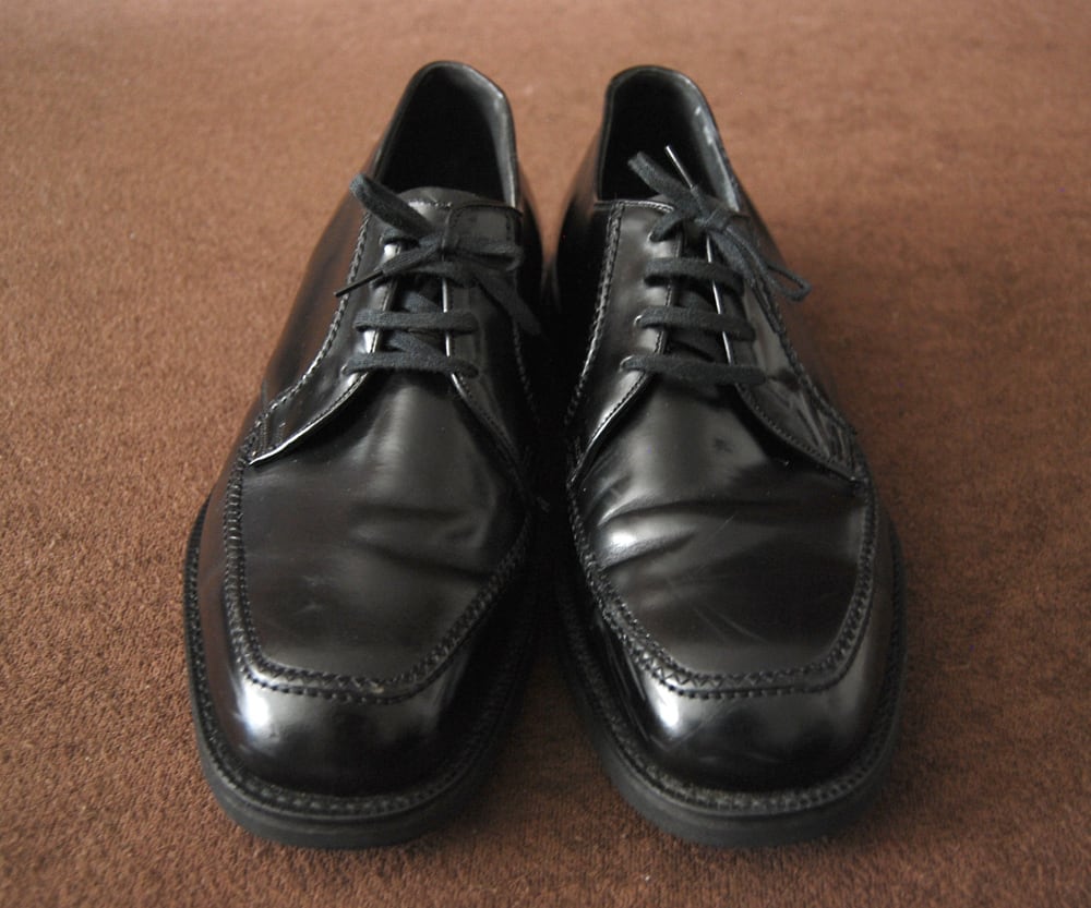 光沢のあるレザーとクロスステッチで編み込んだスクエア型モックトゥがクラシカルです。