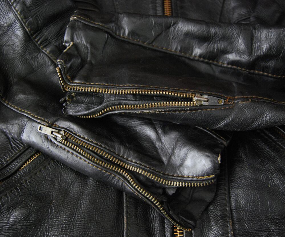 ブラスの渋いゴールドのジッパーに真っ黒なシボたっぷりのレザーがオーラを放っています。